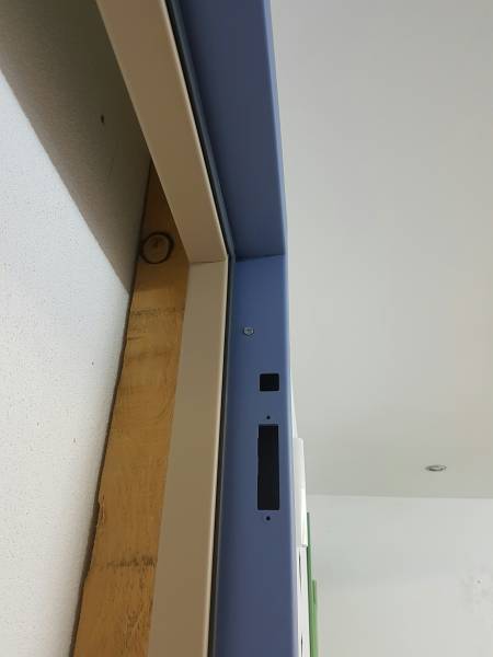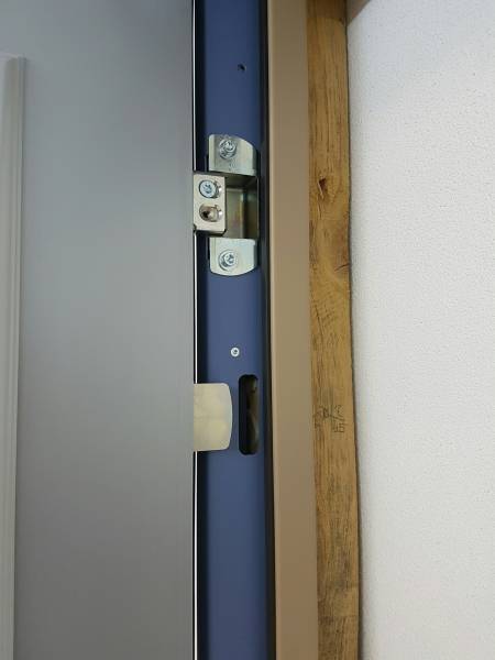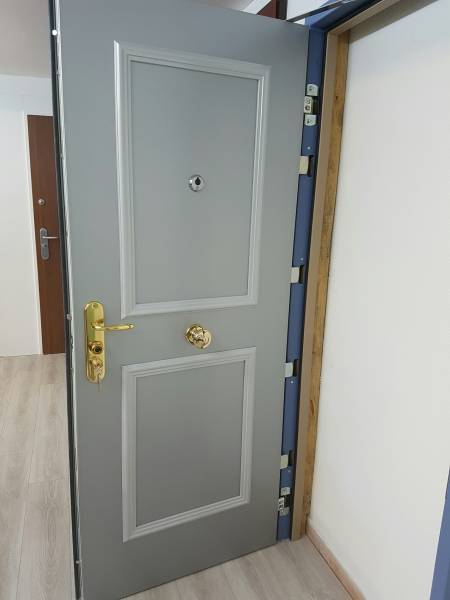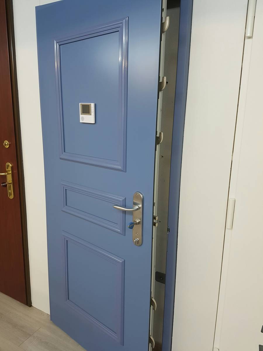 Une tôle laquée bleu lavande et des moulures modèle 1 habillent l’intérieur du bloc-porte, une tôle laquée alu et des moulures modèle 3 vous est présentée à l’extérieur.