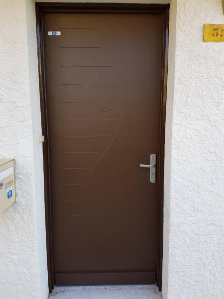 STYLEA S est une porte avec fermeture 3 points, certifiée A2P* BP1 (5 minutes de résistance lors d’un cambriolage). La porte installée est habillée d’une tôle laquée marron à l’extérieur avec un décor non vitré modèle I, et d’une tôle laquée lisse blanche à l’intérieur.